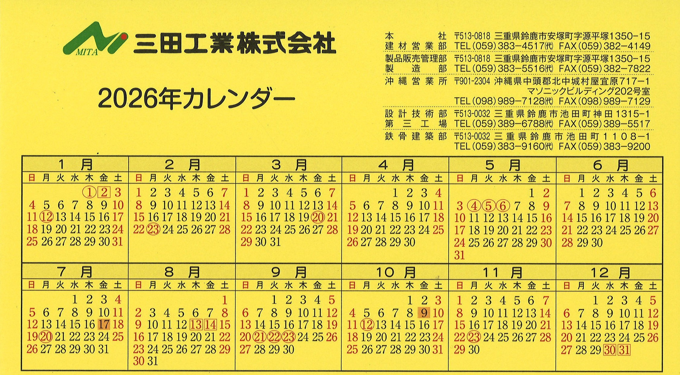 お知らせ・トピックス2026年カレンダー2026.01.07お知らせ 赤字:三田工業休日 製品のお問い合わせはこちらご質問やご相談など、お気軽にお問い合わせください。お電話でのお問い合わせ059-383-4517〈営業時間〉平日9:00~17:00ウェブからのお問い合わせ