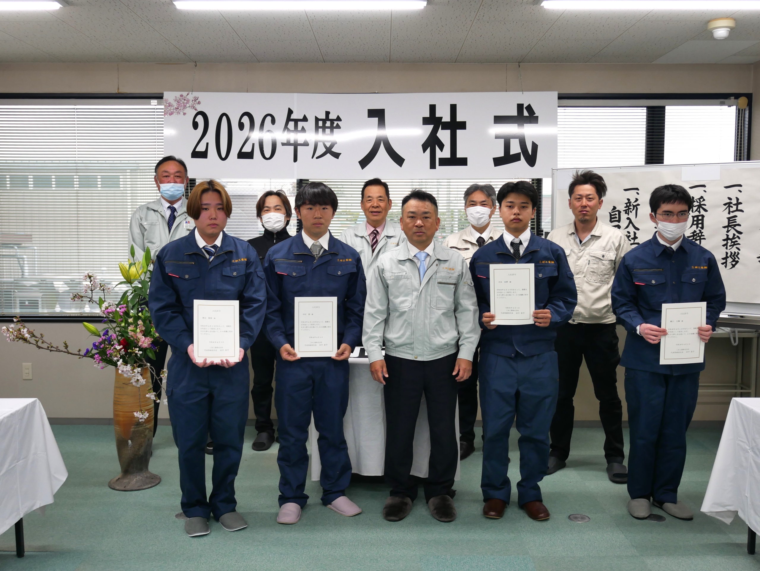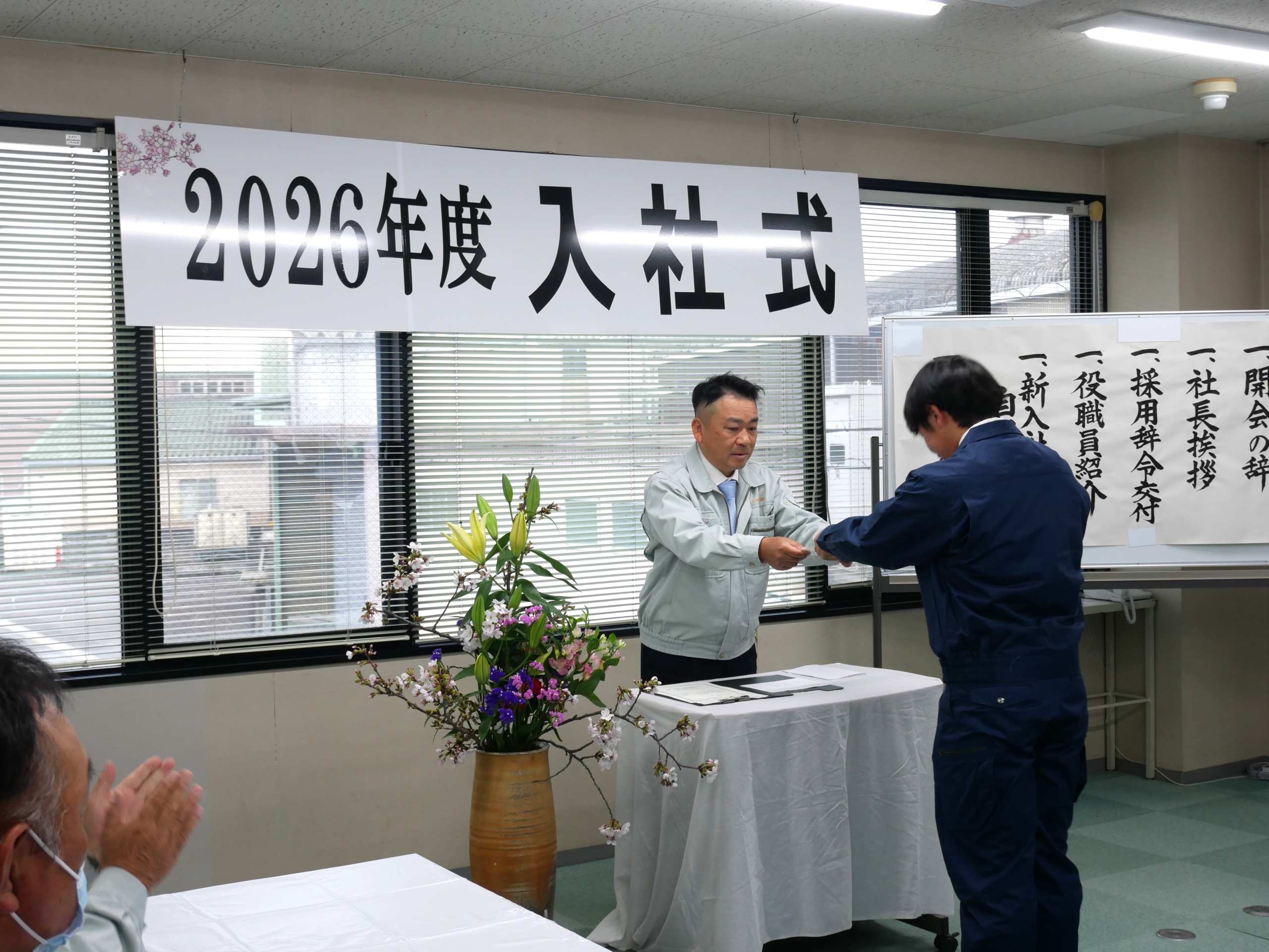 令和8年度 入社式を行いました。2026.04.02トピックス本日、本社2階会議室にて入社式を行いました。新たに4名の仲間を迎え、社員一同大変嬉しく思っております。これから共に成長していけることを、楽しみにしております。